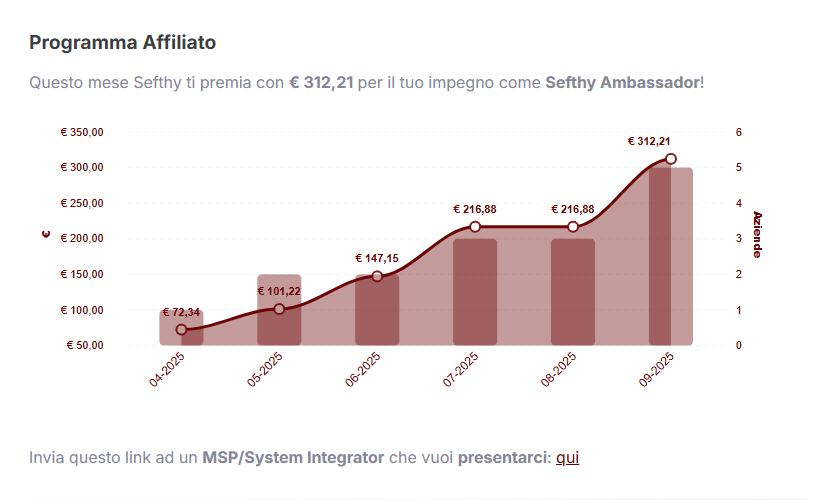 Da qui é possibile condividere il link con un MSP o System Integrator e guadagnare il 20% su tutti i ricavi che quest’ultimo genera verso Sefthy.